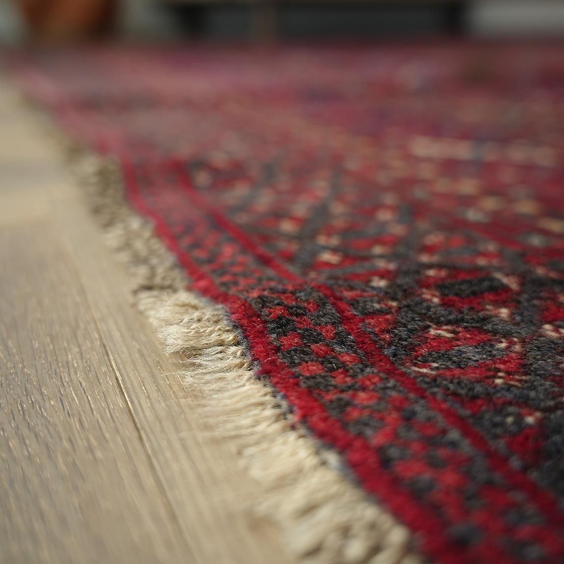 デザイン自体はサルークらしいオーソドックスなモチーフを採用していますが、通常は赤に紺色を合わせることが多い中で、このラグは珍しく紺色の部分に茶色を使用しています。そのため、全体的に柔らかく、やさしい印象を与える仕上がりになっており、空間にしっくりと馴染む雰囲気を持っています。