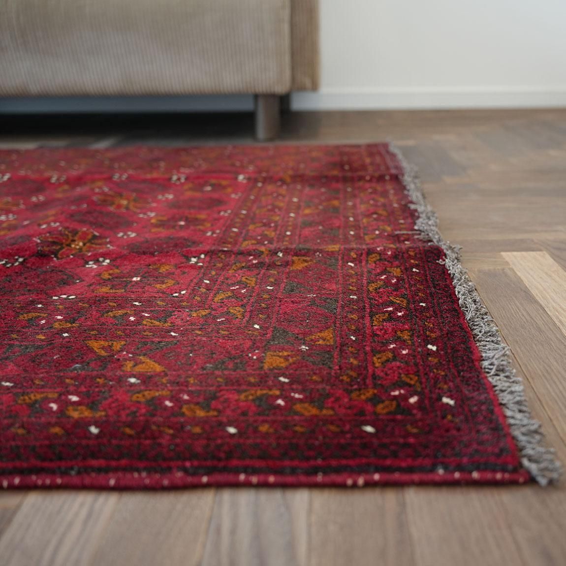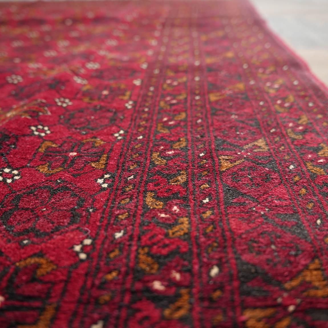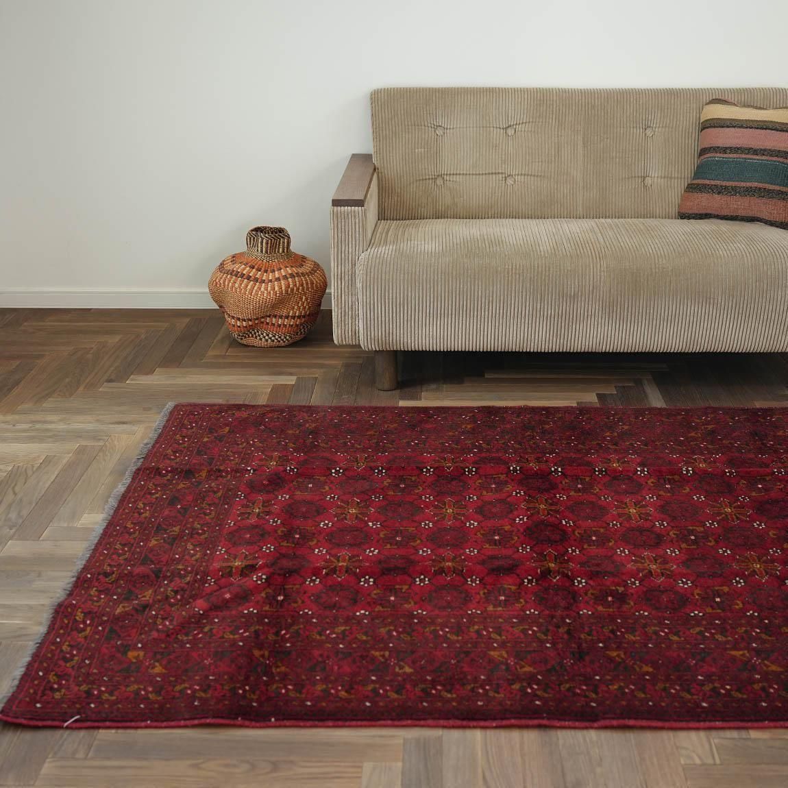赤いベースカラーに、赤系のお花と小さな白いお花が散りばめられたデザインは、お部屋に温かみと上品な華やかさをもたらしてくれます。伝統的なトルクメンらしい幾何学的な花のモチーフが、クラシックでありながらも現代のインテリアにもすっと馴染む佇まいです。