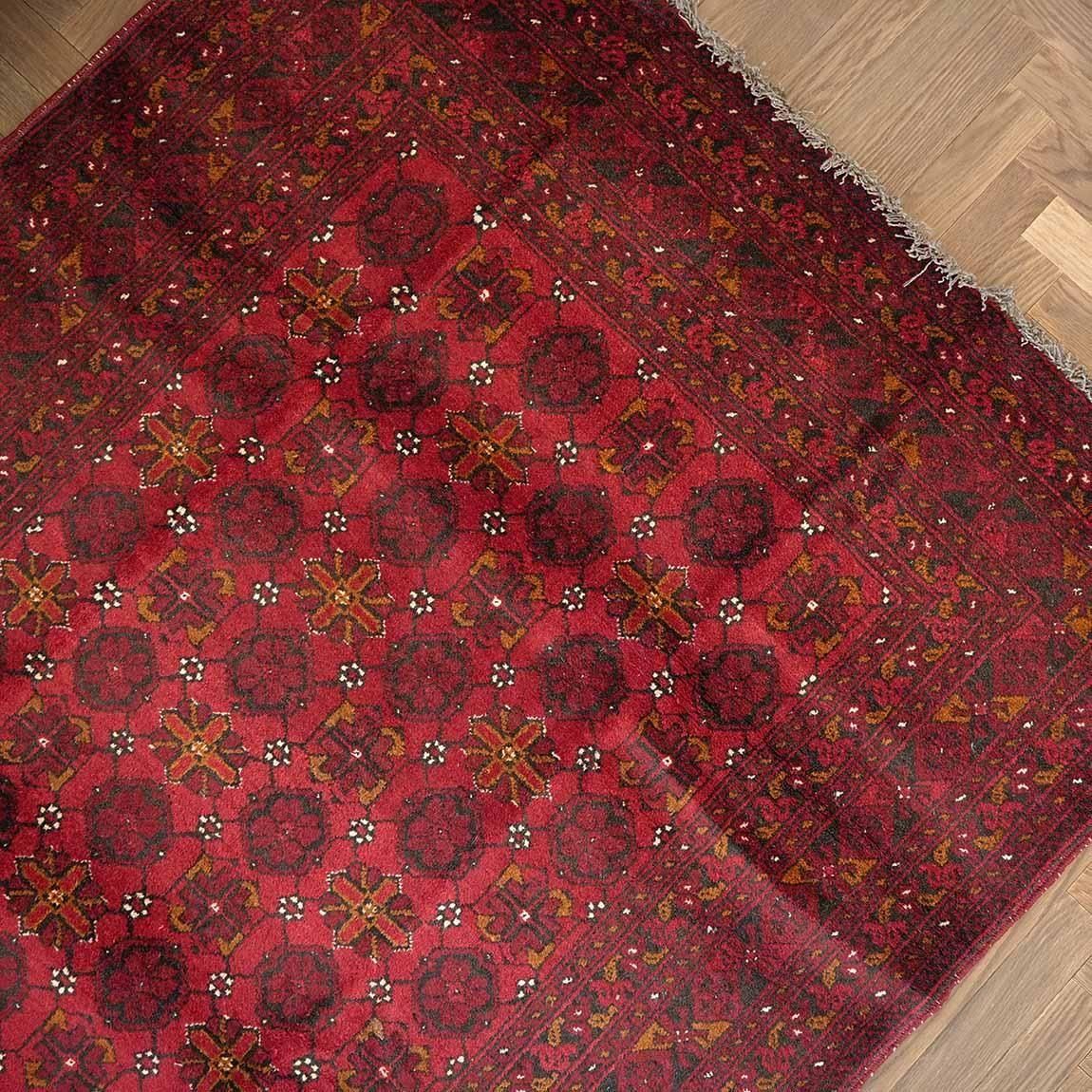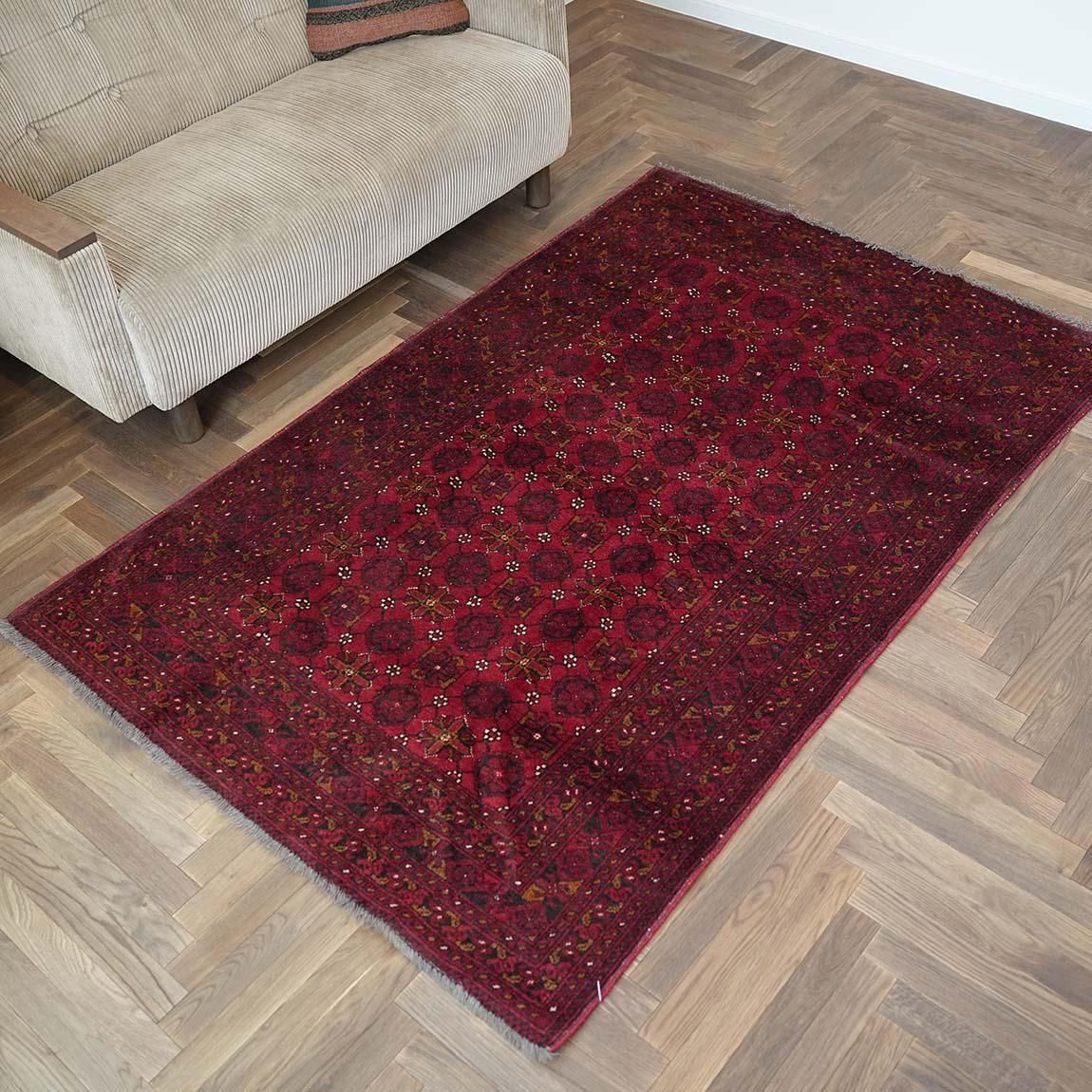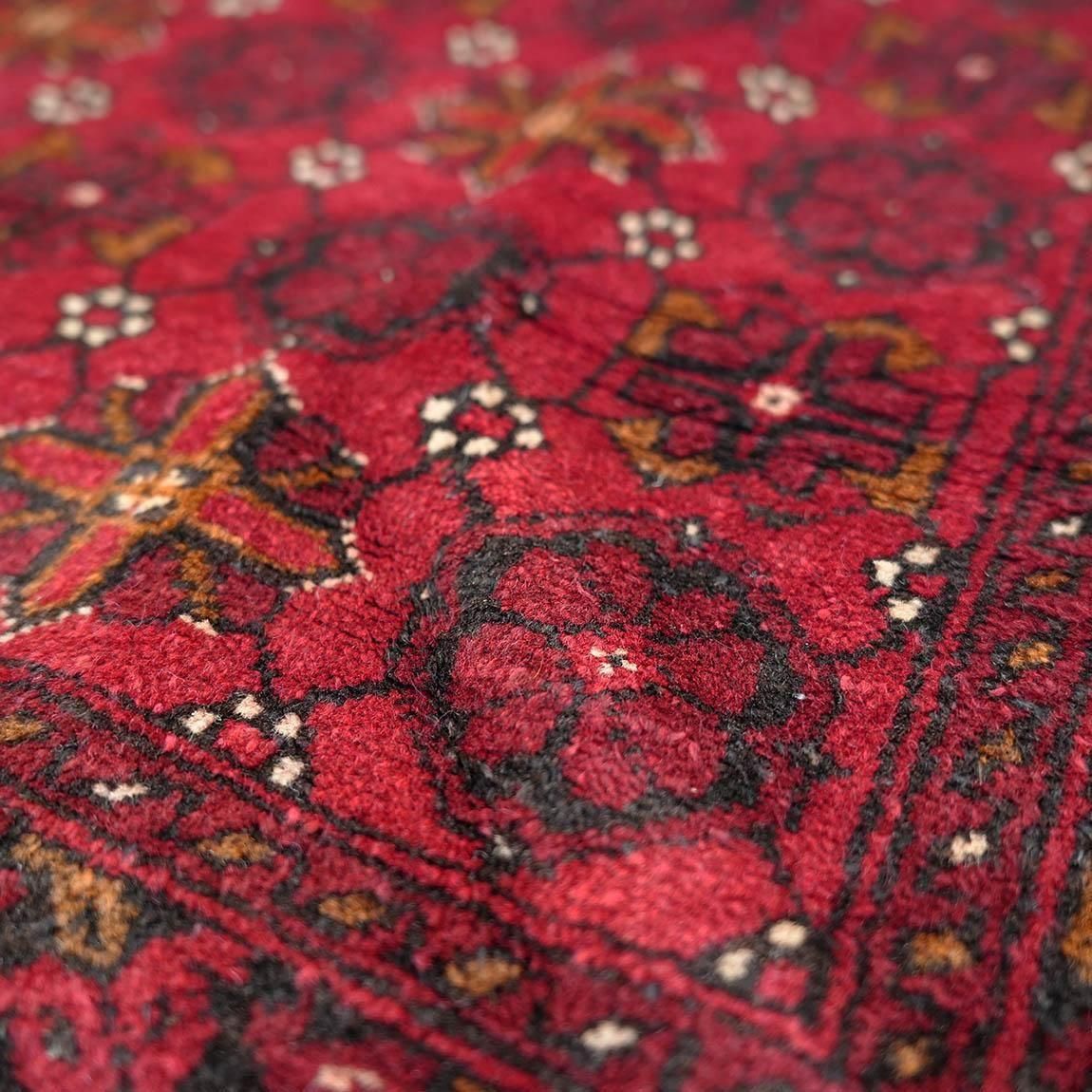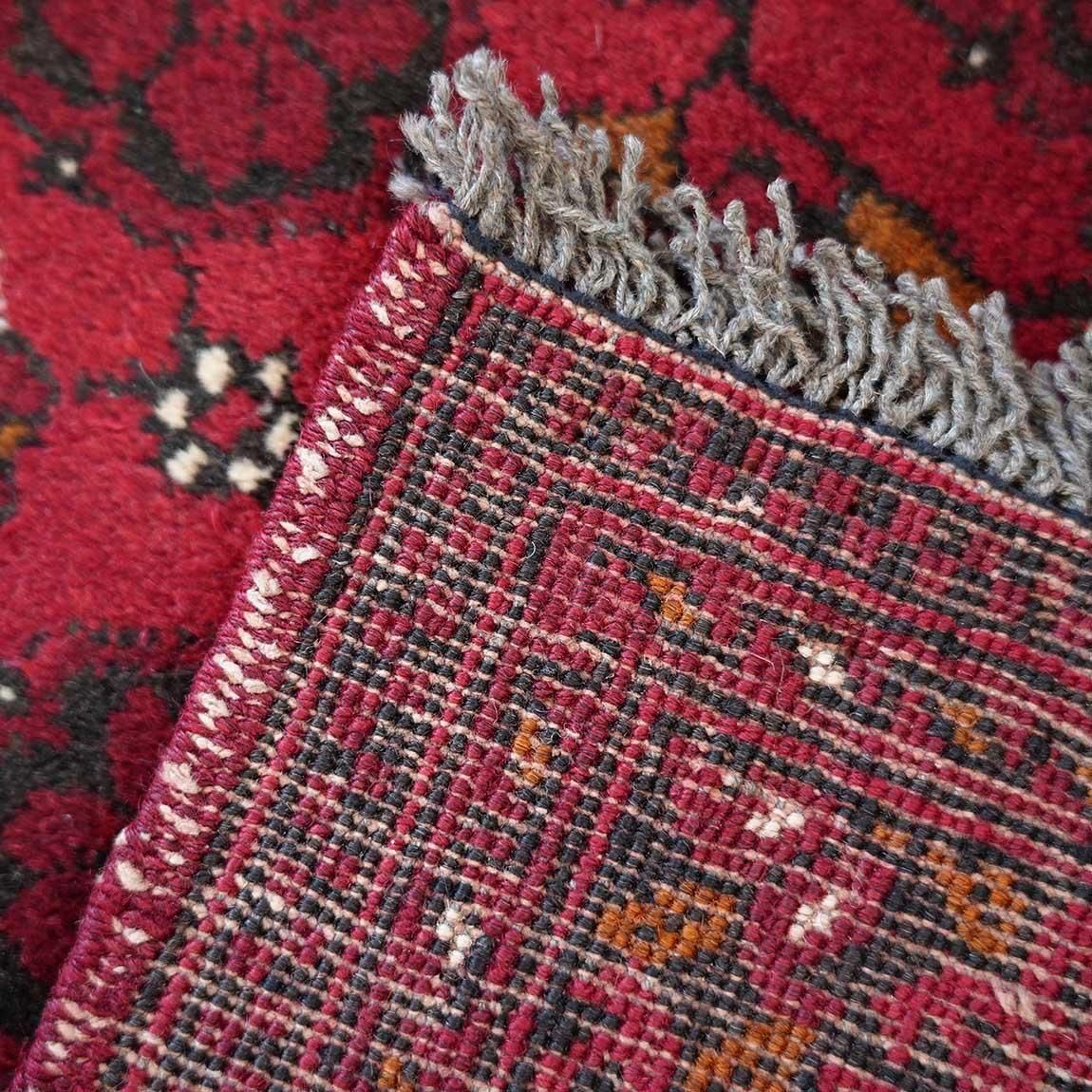赤いベースカラーに、赤系のお花と小さな白いお花が散りばめられたデザインは、お部屋に温かみと上品な華やかさをもたらしてくれます。伝統的なトルクメンらしい幾何学的な花のモチーフが、クラシックでありながらも現代のインテリアにもすっと馴染む佇まいです。