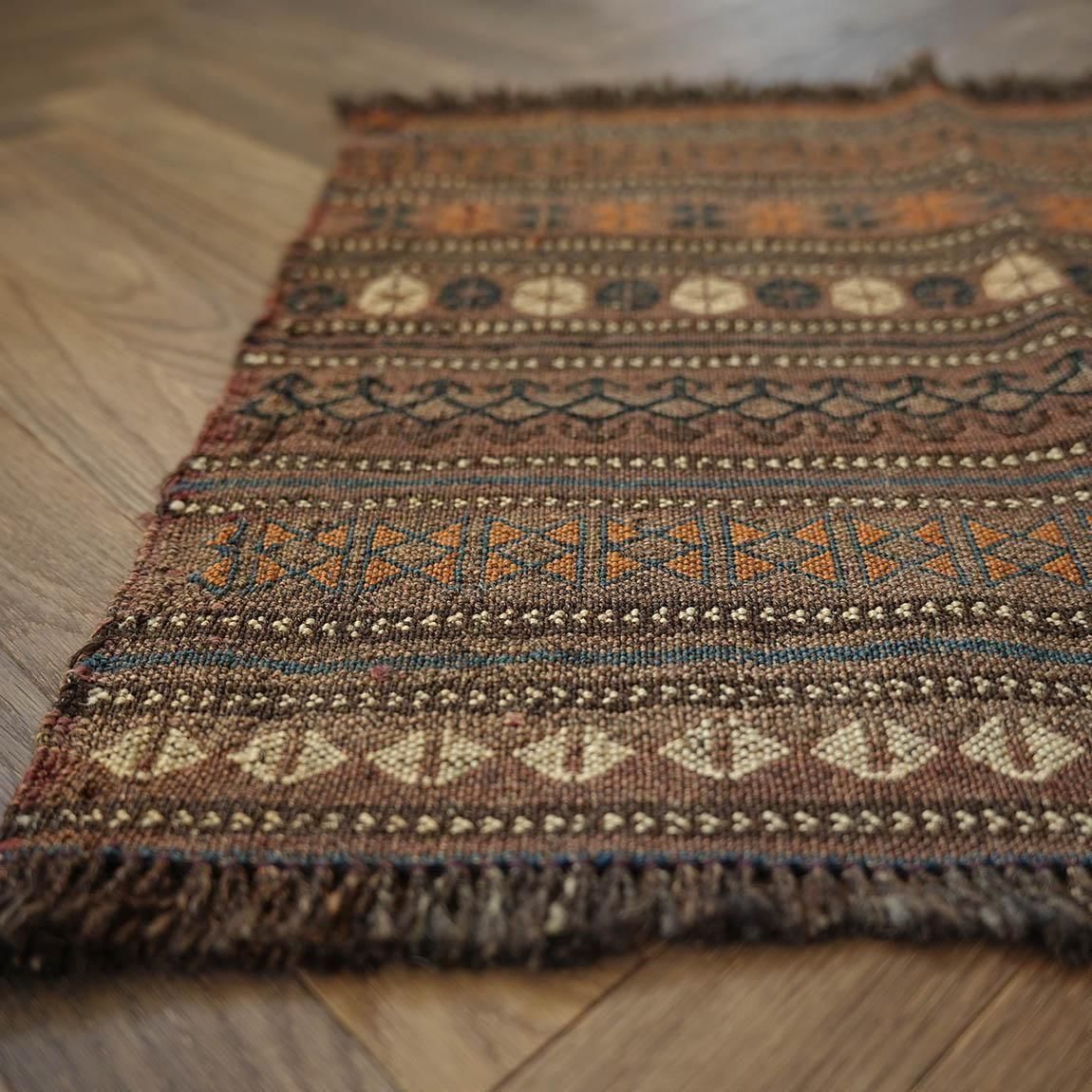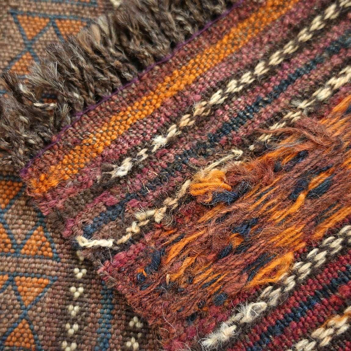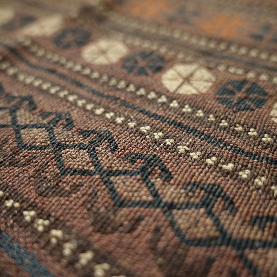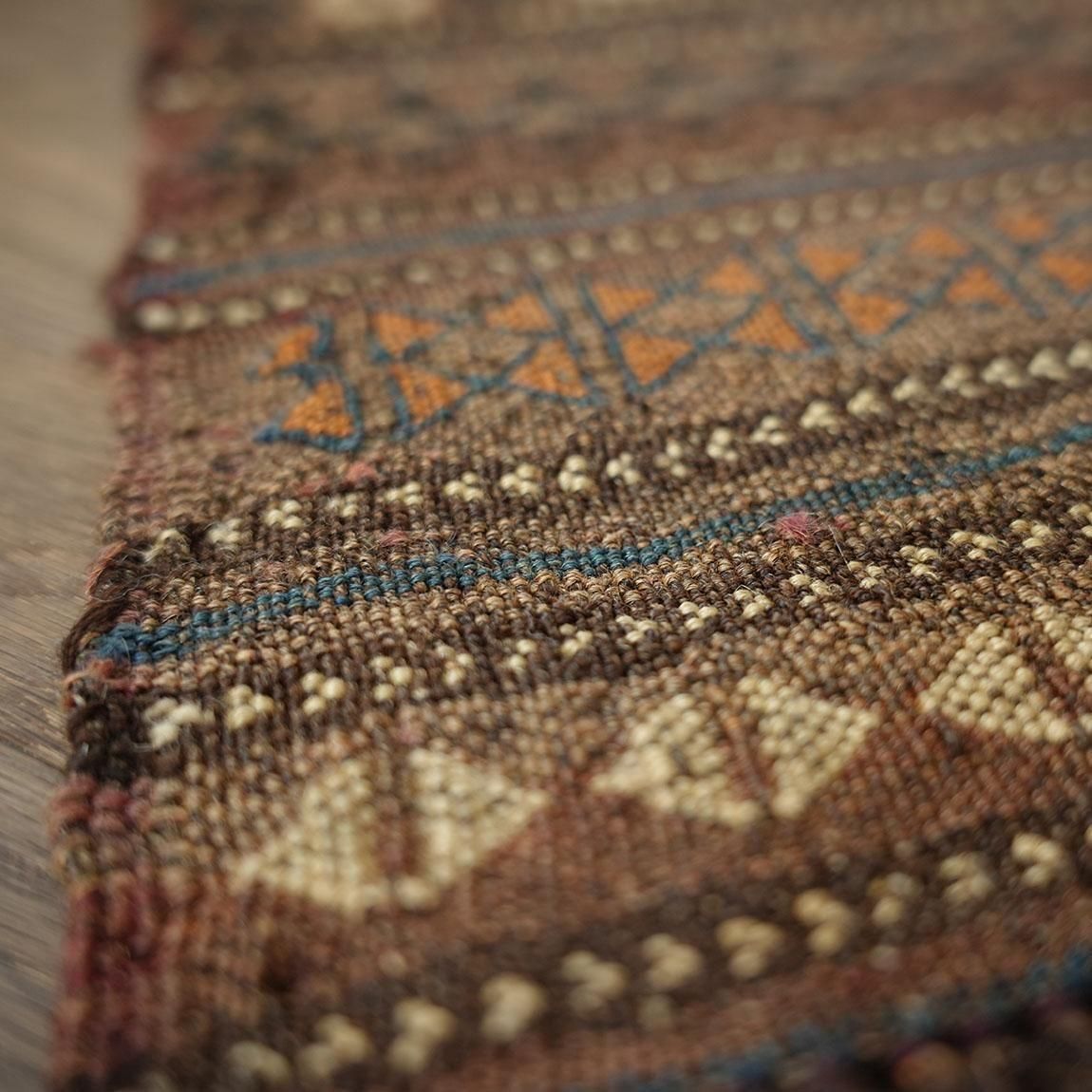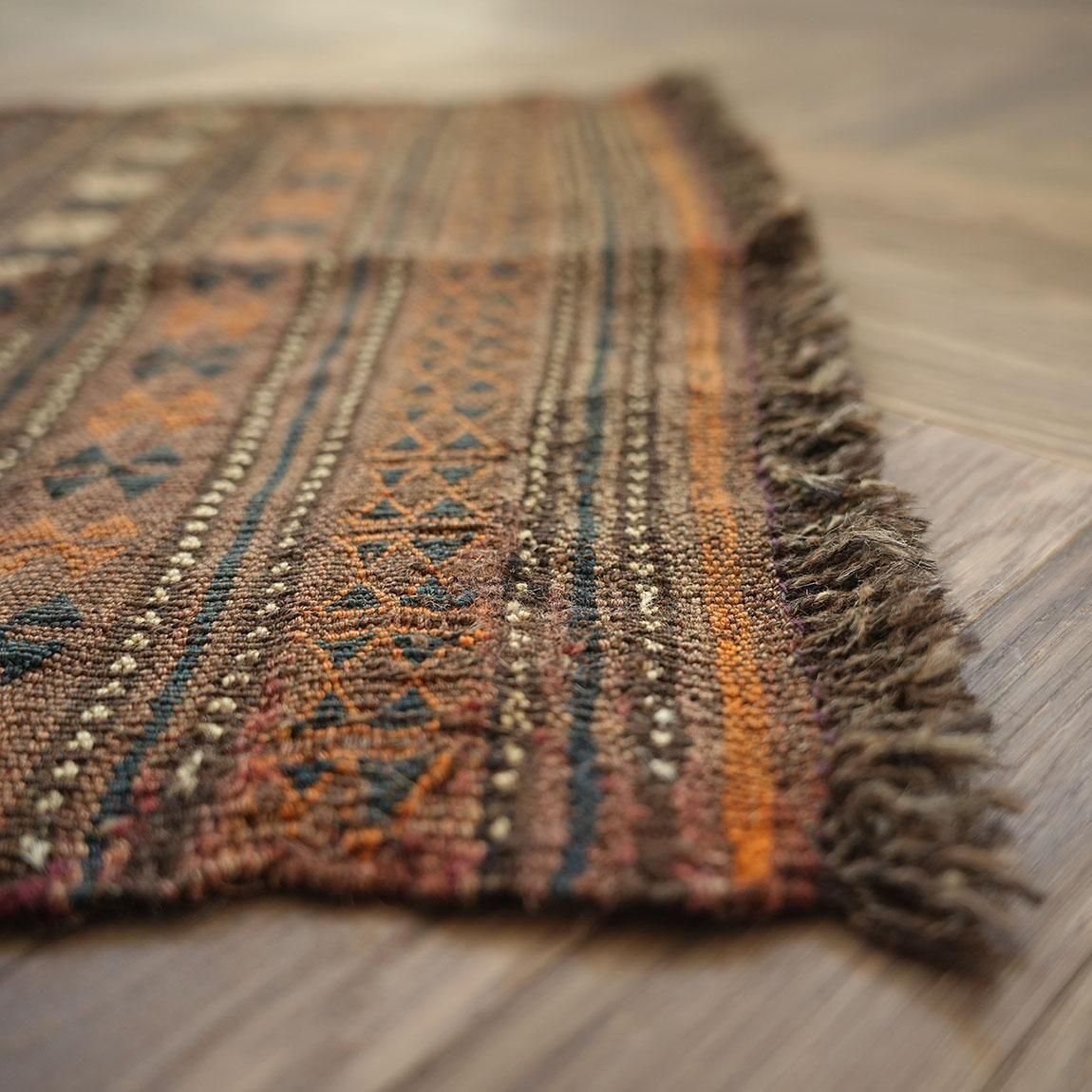 時々裏返してみると、当時の鮮やかな色彩に出会えるのも楽しみのひとつ。表面の渋さと裏面の鮮やかさ、どちらもこのキリムが歩んできた時間の物語を語ってくれています。